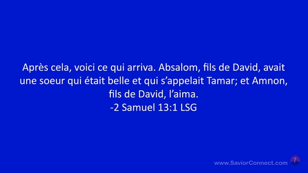 Après cela, voici ce qui arriva. Absalom, fils de David, avait une soeur qui était belle et qui s'appelait Tamar; et Amnon, fils de David, l'aima. -2 Samuel 13:1 LSG