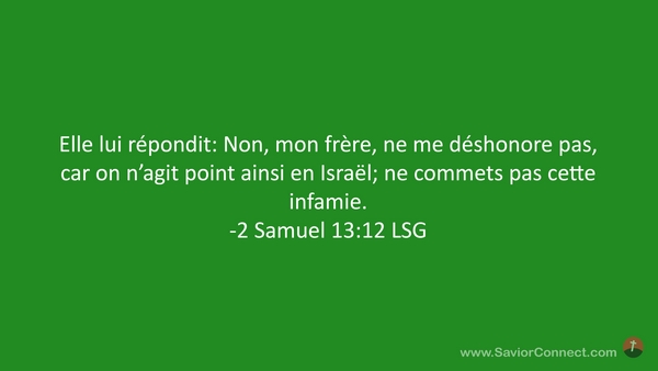 Elle lui répondit: Non, mon frère, ne me déshonore pas, car on n'agit point ainsi en Israël; ne commets pas cette infamie. -2 Samuel 13:12 LSG