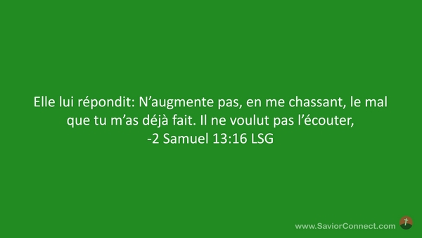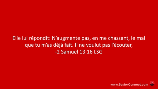Elle lui répondit: N'augmente pas, en me chassant, le mal que tu m'as déjà fait. Il ne voulut pas l'écouter, -2 Samuel 13:16 LSG