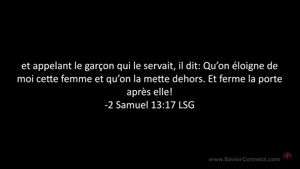 et appelant le garçon qui le servait, il dit: Qu'on éloigne de moi cette femme et qu'on la mette dehors. Et ferme la porte après elle! -2 Samuel 13:17 LSG
