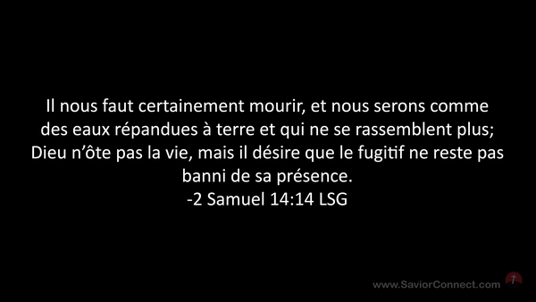 Il nous faut certainement mourir, et nous serons comme des eaux répandues à terre et qui ne se rassemblent plus; Dieu n'ôte pas la vie, mais il désire que le fugitif ne reste pas banni de sa présence. -2 Samuel 14:14 LSG