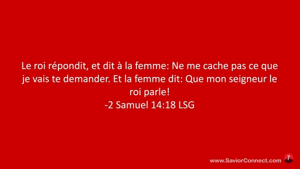 Le roi répondit, et dit à la femme: Ne me cache pas ce que je vais te demander. Et la femme dit: Que mon seigneur le roi parle! -2 Samuel 14:18 LSG