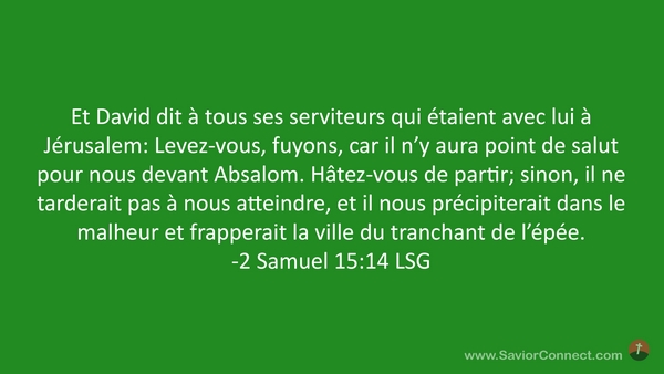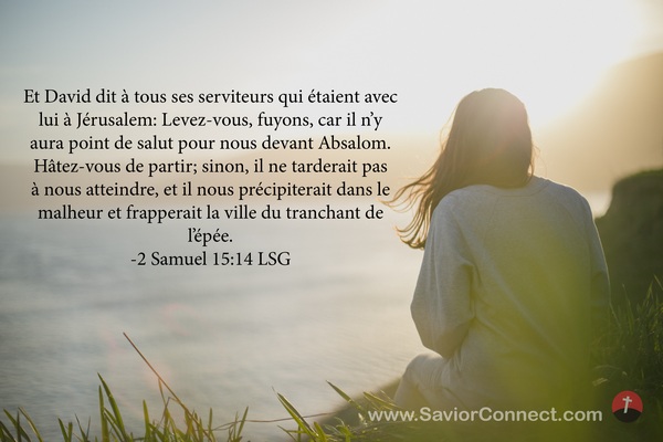 Et David dit à tous ses serviteurs qui étaient avec lui à Jérusalem: Levez-vous, fuyons, car il n'y aura point de salut pour nous devant Absalom. Hâtez-vous de partir; sinon, il ne tarderait pas à nous atteindre, et il nous précipiterait dans le malheur et frapperait la ville du tranchant de l'épée. -2 Samuel 15:14 LSG