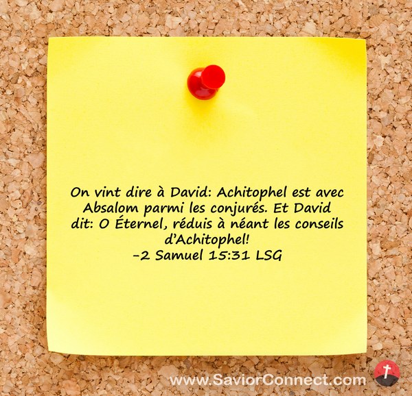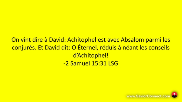 On vint dire à David: Achitophel est avec Absalom parmi les conjurés. Et David dit: O Éternel, réduis à néant les conseils d'Achitophel! -2 Samuel 15:31 LSG