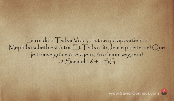 Le roi dit à Tsiba: Voici, tout ce qui appartient à Mephiboscheth est à toi. Et Tsiba dit: Je me prosterne! Que je trouve grâce à tes yeux, ô roi mon seigneur! -2 Samuel 16:4 LSG