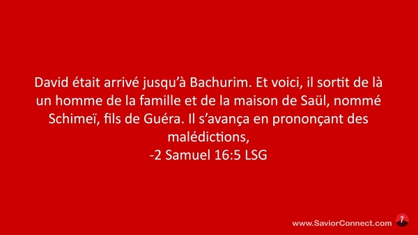 David était arrivé jusqu'à Bachurim. Et voici, il sortit de là un homme de la famille et de la maison de Saül, nommé Schimeï, fils de Guéra. Il s'avança en prononçant des malédictions, -2 Samuel 16:5 LSG