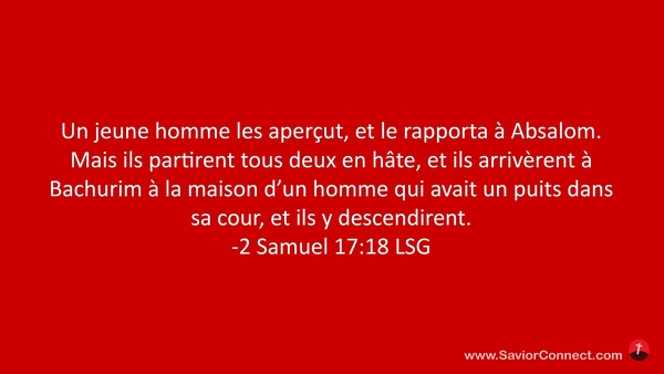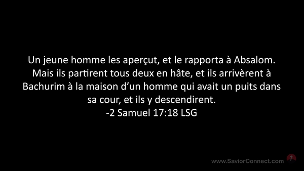 Un jeune homme les aperçut, et le rapporta à Absalom. Mais ils partirent tous deux en hâte, et ils arrivèrent à Bachurim à la maison d'un homme qui avait un puits dans sa cour, et ils y descendirent. -2 Samuel 17:18 LSG