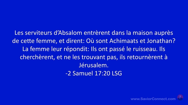 Les serviteurs d'Absalom entrèrent dans la maison auprès de cette femme, et dirent: Où sont Achimaats et Jonathan? La femme leur répondit: Ils ont passé le ruisseau. Ils cherchèrent, et ne les trouvant pas, ils retournèrent à Jérusalem. -2 Samuel 17:20 LSG