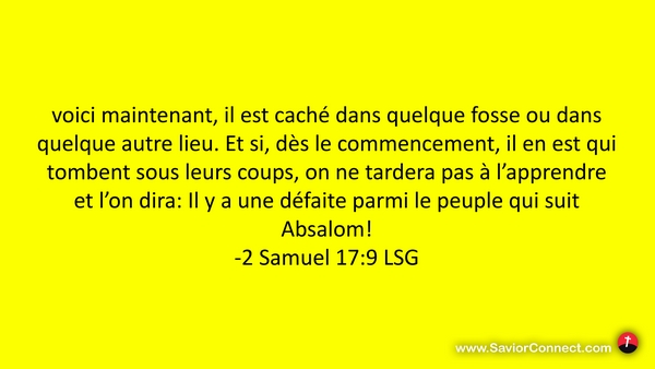 voici maintenant, il est caché dans quelque fosse ou dans quelque autre lieu. Et si, dès le commencement, il en est qui tombent sous leurs coups, on ne tardera pas à l'apprendre et l'on dira: Il y a une défaite parmi le peuple qui suit Absalom! -2 Samuel 17:9 LSG