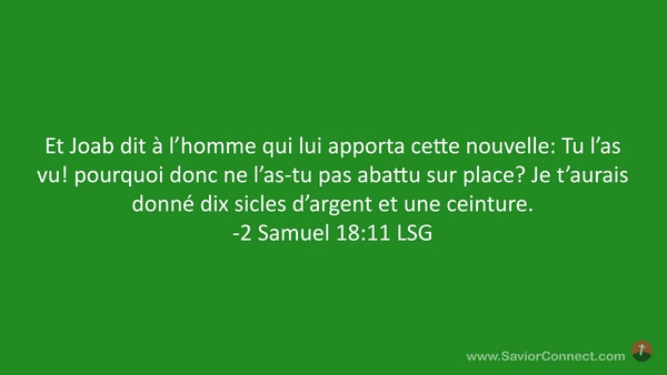 Et Joab dit à l'homme qui lui apporta cette nouvelle: Tu l'as vu! pourquoi donc ne l'as-tu pas abattu sur place? Je t'aurais donné dix sicles d'argent et une ceinture. -2 Samuel 18:11 LSG