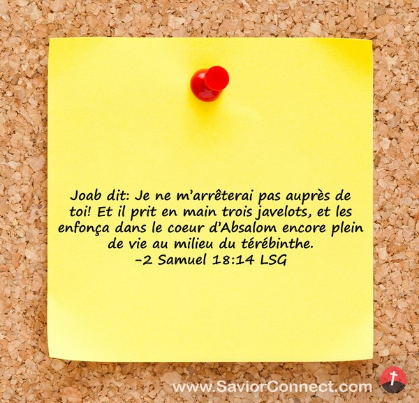 Joab dit: Je ne m'arrêterai pas auprès de toi! Et il prit en main trois javelots, et les enfonça dans le coeur d'Absalom encore plein de vie au milieu du térébinthe. -2 Samuel 18:14 LSG