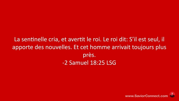 La sentinelle cria, et avertit le roi. Le roi dit: S'il est seul, il apporte des nouvelles. Et cet homme arrivait toujours plus près. -2 Samuel 18:25 LSG