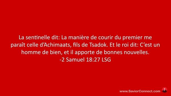 La sentinelle dit: La manière de courir du premier me paraît celle d'Achimaats, fils de Tsadok. Et le roi dit: C'est un homme de bien, et il apporte de bonnes nouvelles. -2 Samuel 18:27 LSG