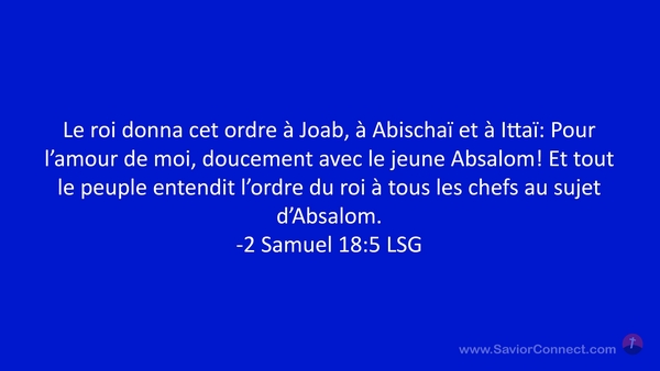 Le roi donna cet ordre à Joab, à Abischaï et à Ittaï: Pour l'amour de moi, doucement avec le jeune Absalom! Et tout le peuple entendit l'ordre du roi à tous les chefs au sujet d'Absalom. -2 Samuel 18:5 LSG