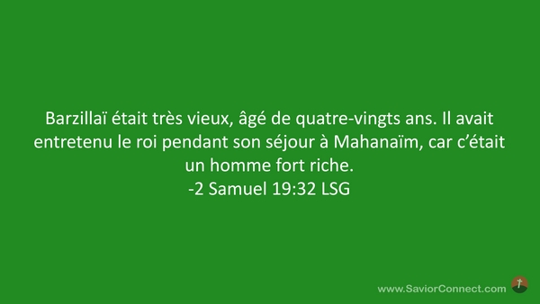 Barzillaï était très vieux, âgé de quatre-vingts ans. Il avait entretenu le roi pendant son séjour à Mahanaïm, car c'était un homme fort riche. -2 Samuel 19:32 LSG