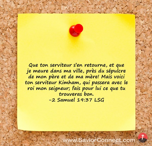 Que ton serviteur s'en retourne, et que je meure dans ma ville, près du sépulcre de mon père et de ma mère! Mais voici ton serviteur Kimham, qui passera avec le roi mon seigneur; fais pour lui ce que tu trouveras bon. -2 Samuel 19:37 LSG