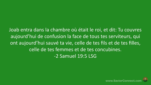 Joab entra dans la chambre où était le roi, et dit: Tu couvres aujourd'hui de confusion la face de tous tes serviteurs, qui ont aujourd'hui sauvé ta vie, celle de tes fils et de tes filles, celle de tes femmes et de tes concubines. -2 Samuel 19:5 LSG