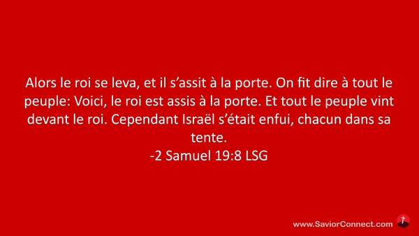 Alors le roi se leva, et il s'assit à la porte. On fit dire à tout le peuple: Voici, le roi est assis à la porte. Et tout le peuple vint devant le roi. Cependant Israël s'était enfui, chacun dans sa tente. -2 Samuel 19:8 LSG