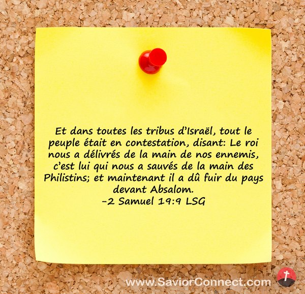 Et dans toutes les tribus d'Israël, tout le peuple était en contestation, disant: Le roi nous a délivrés de la main de nos ennemis, c'est lui qui nous a sauvés de la main des Philistins; et maintenant il a dû fuir du pays devant Absalom. -2 Samuel 19:9 LSG