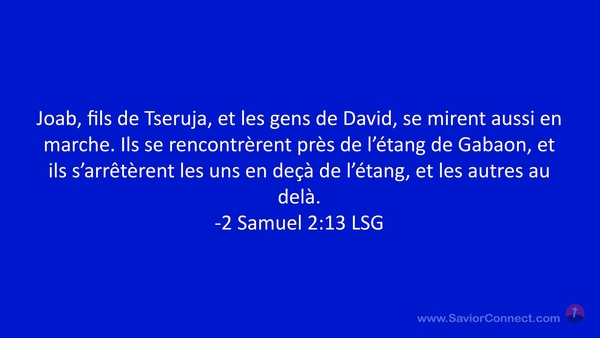 Joab, fils de Tseruja, et les gens de David, se mirent aussi en marche. Ils se rencontrèrent près de l'étang de Gabaon, et ils s'arrêtèrent les uns en deçà de l'étang, et les autres au delà. -2 Samuel 2:13 LSG