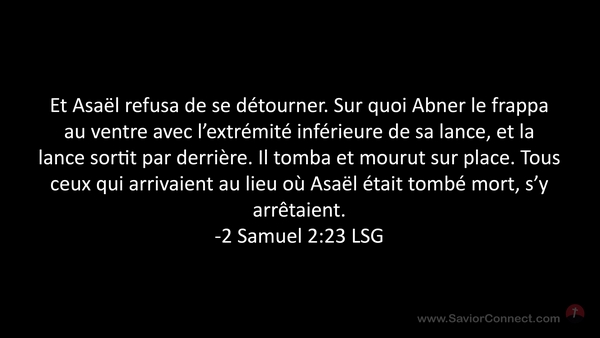 Et Asaël refusa de se détourner. Sur quoi Abner le frappa au ventre avec l'extrémité inférieure de sa lance, et la lance sortit par derrière. Il tomba et mourut sur place. Tous ceux qui arrivaient au lieu où Asaël était tombé mort, s'y arrêtaient. -2 Samuel 2:23 LSG