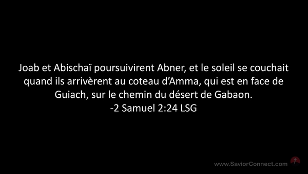 Joab et Abischaï poursuivirent Abner, et le soleil se couchait quand ils arrivèrent au coteau d'Amma, qui est en face de Guiach, sur le chemin du désert de Gabaon. -2 Samuel 2:24 LSG