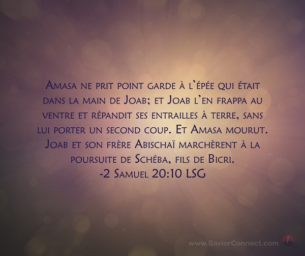 Amasa ne prit point garde à l'épée qui était dans la main de Joab; et Joab l'en frappa au ventre et répandit ses entrailles à terre, sans lui porter un second coup. Et Amasa mourut. Joab et son frère Abischaï marchèrent à la poursuite de Schéba, fils de Bicri. -2 Samuel 20:10 LSG