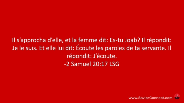 Il s'approcha d'elle, et la femme dit: Es-tu Joab? Il répondit: Je le suis. Et elle lui dit: Écoute les paroles de ta servante. Il répondit: J'écoute. -2 Samuel 20:17 LSG