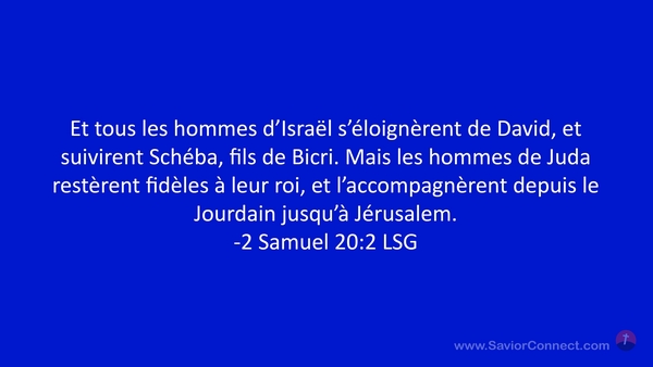 Et tous les hommes d'Israël s'éloignèrent de David, et suivirent Schéba, fils de Bicri. Mais les hommes de Juda restèrent fidèles à leur roi, et l'accompagnèrent depuis le Jourdain jusqu'à Jérusalem. -2 Samuel 20:2 LSG
