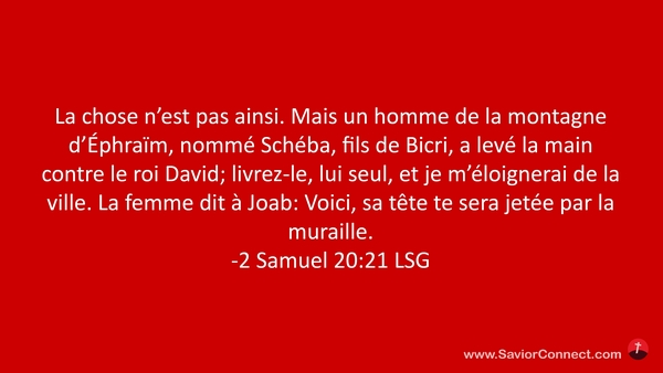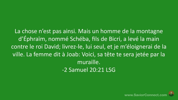 La chose n'est pas ainsi. Mais un homme de la montagne d'Éphraïm, nommé Schéba, fils de Bicri, a levé la main contre le roi David; livrez-le, lui seul, et je m'éloignerai de la ville. La femme dit à Joab: Voici, sa tête te sera jetée par la muraille. -2 Samuel 20:21 LSG