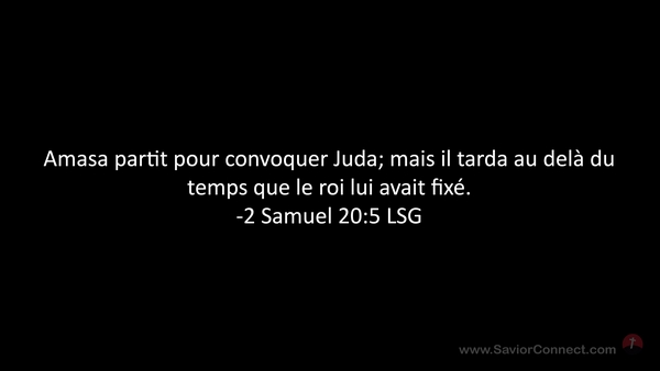 Amasa partit pour convoquer Juda; mais il tarda au delà du temps que le roi lui avait fixé. -2 Samuel 20:5 LSG