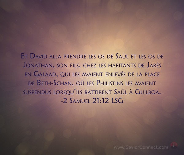 Et David alla prendre les os de Saül et les os de Jonathan, son fils, chez les habitants de Jabès en Galaad, qui les avaient enlevés de la place de Beth-Schan, où les Philistins les avaient suspendus lorsqu'ils battirent Saül à Guilboa. -2 Samuel 21:12 LSG
