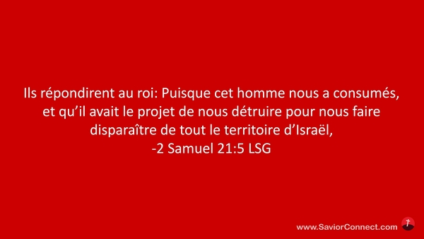 Ils répondirent au roi: Puisque cet homme nous a consumés, et qu'il avait le projet de nous détruire pour nous faire disparaître de tout le territoire d'Israël, -2 Samuel 21:5 LSG