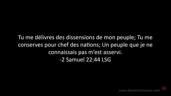Tu me délivres des dissensions de mon peuple; Tu me conserves pour chef des nations; Un peuple que je ne connaissais pas m'est asservi. -2 Samuel 22:44 LSG