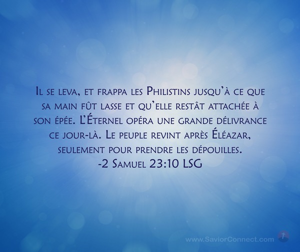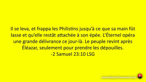 Il se leva, et frappa les Philistins jusqu'à ce que sa main fût lasse et qu'elle restât attachée à son épée. L'Éternel opéra une grande délivrance ce jour-là. Le peuple revint après Éléazar, seulement pour prendre les dépouilles. -2 Samuel 23:10 LSG