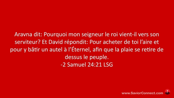 Aravna dit: Pourquoi mon seigneur le roi vient-il vers son serviteur? Et David répondit: Pour acheter de toi l'aire et pour y bâtir un autel à l'Éternel, afin que la plaie se retire de dessus le peuple. -2 Samuel 24:21 LSG