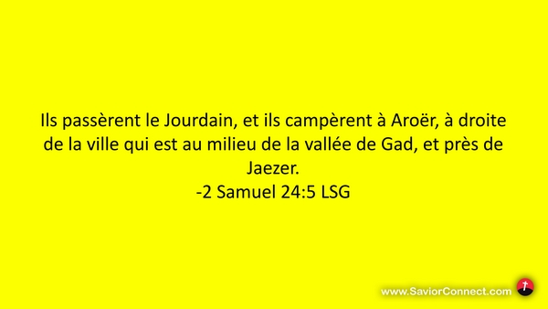 Ils passèrent le Jourdain, et ils campèrent à Aroër, à droite de la ville qui est au milieu de la vallée de Gad, et près de Jaezer. -2 Samuel 24:5 LSG