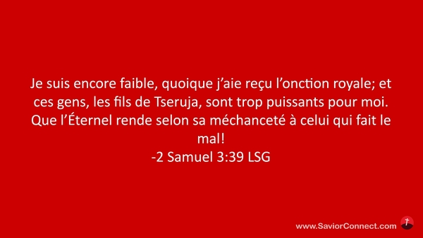 Je suis encore faible, quoique j'aie reçu l'onction royale; et ces gens, les fils de Tseruja, sont trop puissants pour moi. Que l'Éternel rende selon sa méchanceté à celui qui fait le mal! -2 Samuel 3:39 LSG