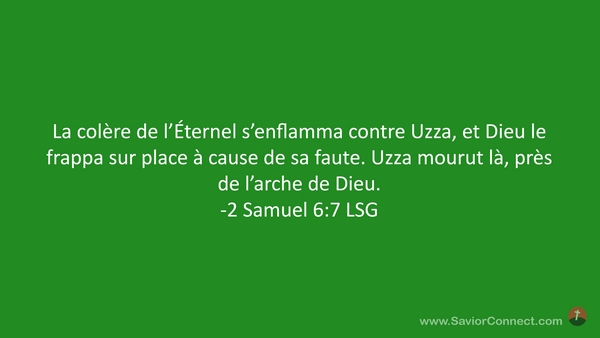 La colère de l'Éternel s'enflamma contre Uzza, et Dieu le frappa sur place à cause de sa faute. Uzza mourut là, près de l'arche de Dieu. -2 Samuel 6:7 LSG