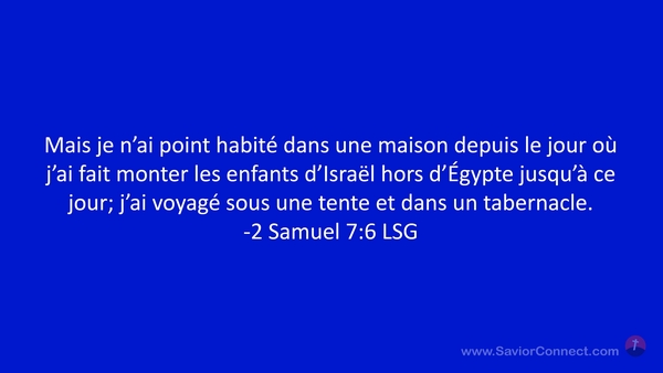 Mais je n'ai point habité dans une maison depuis le jour où j'ai fait monter les enfants d'Israël hors d'Égypte jusqu'à ce jour; j'ai voyagé sous une tente et dans un tabernacle. -2 Samuel 7:6 LSG