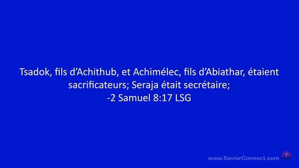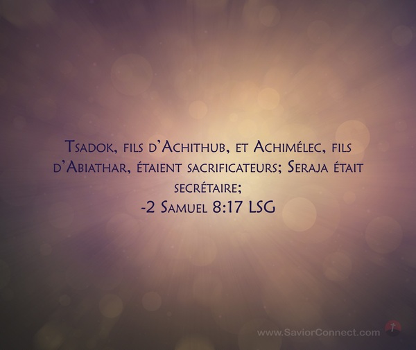 Tsadok, fils d'Achithub, et Achimélec, fils d'Abiathar, étaient sacrificateurs; Seraja était secrétaire; -2 Samuel 8:17 LSG