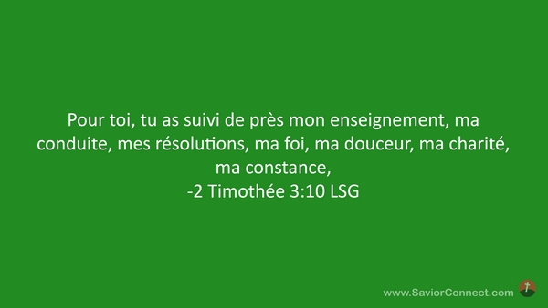 Pour toi, tu as suivi de près mon enseignement, ma conduite, mes résolutions, ma foi, ma douceur, ma charité, ma constance, -2 Timothée 3:10 LSG
