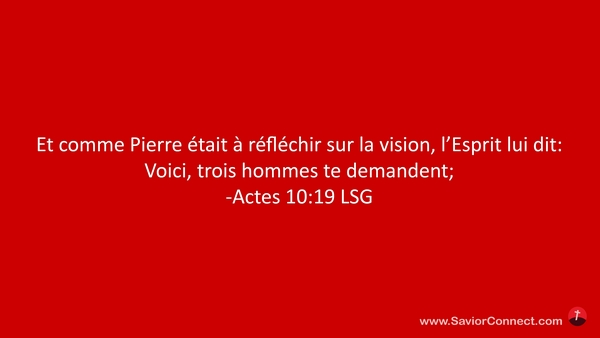 Et comme Pierre était à réfléchir sur la vision, l'Esprit lui dit: Voici, trois hommes te demandent; -Actes 10:19 LSG