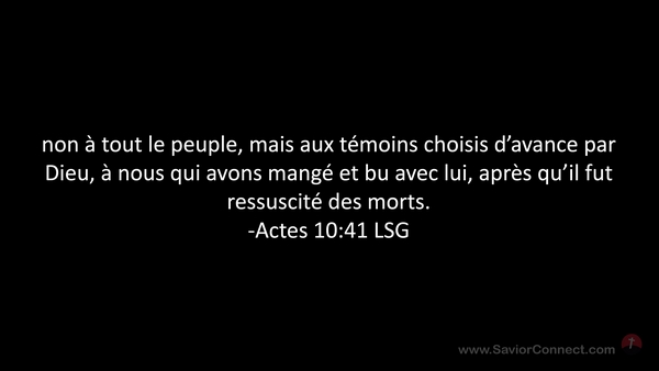 non à tout le peuple, mais aux témoins choisis d'avance par Dieu, à nous qui avons mangé et bu avec lui, après qu'il fut ressuscité des morts. -Actes 10:41 LSG