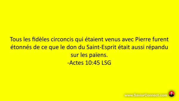 Tous les fidèles circoncis qui étaient venus avec Pierre furent étonnés de ce que le don du Saint-Esprit était aussi répandu sur les païens. -Actes 10:45 LSG