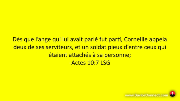 Dès que l'ange qui lui avait parlé fut parti, Corneille appela deux de ses serviteurs, et un soldat pieux d'entre ceux qui étaient attachés à sa personne; -Actes 10:7 LSG