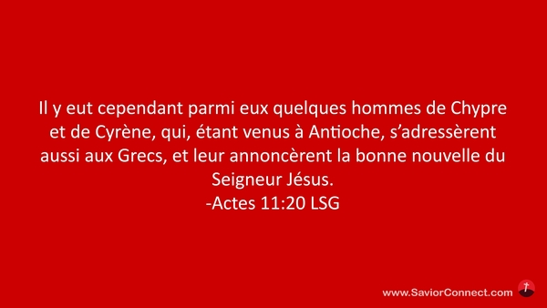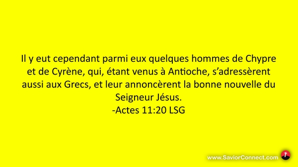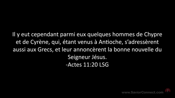 Il y eut cependant parmi eux quelques hommes de Chypre et de Cyrène, qui, étant venus à Antioche, s'adressèrent aussi aux Grecs, et leur annoncèrent la bonne nouvelle du Seigneur Jésus. -Actes 11:20 LSG