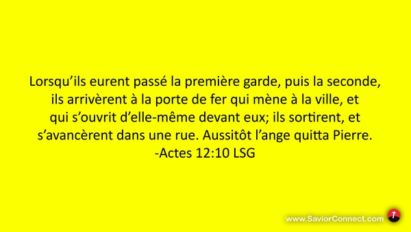 Lorsqu'ils eurent passé la première garde, puis la seconde, ils arrivèrent à la porte de fer qui mène à la ville, et qui s'ouvrit d'elle-même devant eux; ils sortirent, et s'avancèrent dans une rue. Aussitôt l'ange quitta Pierre. -Actes 12:10 LSG