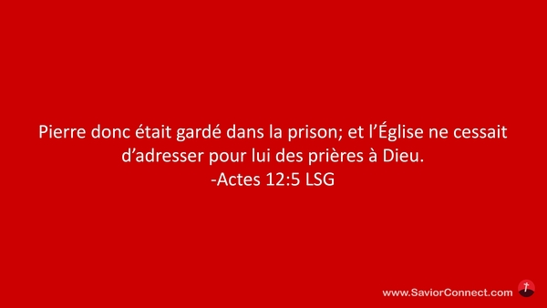 Pierre donc était gardé dans la prison; et l'Église ne cessait d'adresser pour lui des prières à Dieu. -Actes 12:5 LSG