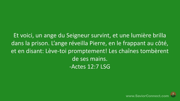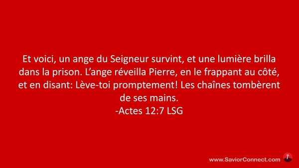 Et voici, un ange du Seigneur survint, et une lumière brilla dans la prison. L'ange réveilla Pierre, en le frappant au côté, et en disant: Lève-toi promptement! Les chaînes tombèrent de ses mains. -Actes 12:7 LSG